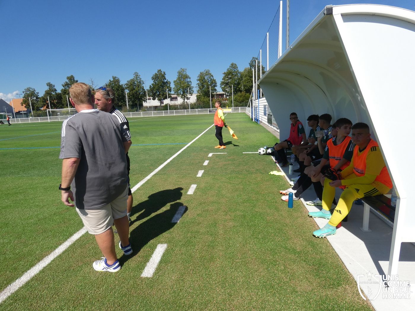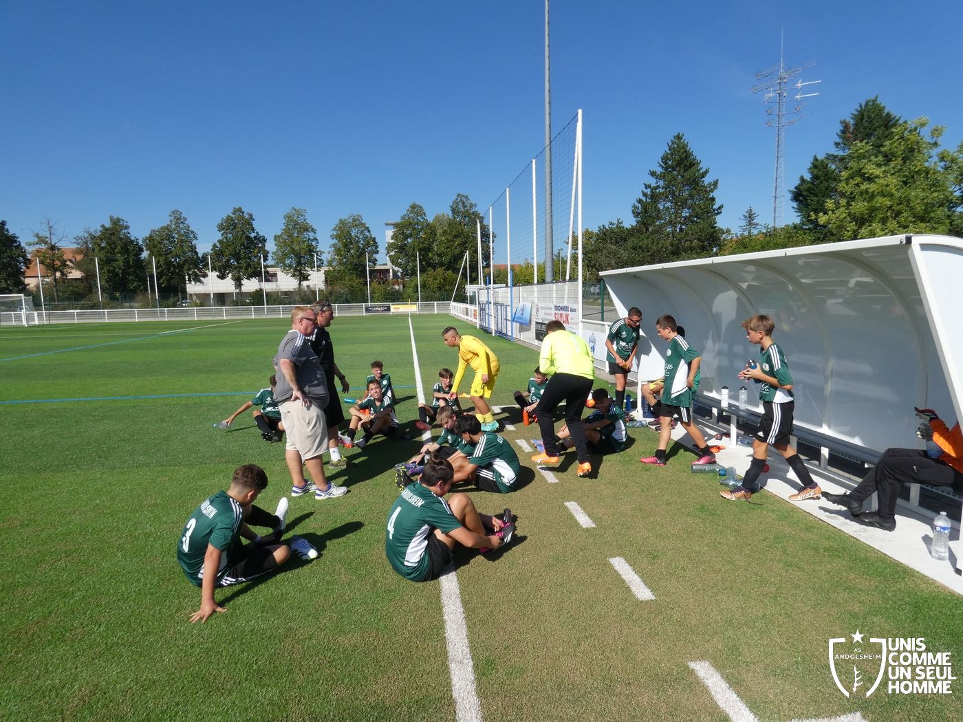 Marc et Steph ont convoqué tout l’effectif pour cette rencontre afin de donner du temps de jeu à tous d’où un banc fourni cet après-midi. Des pauses fraicheurs sont intervenues toutes les vingt minutes car le soleil est bien présent !