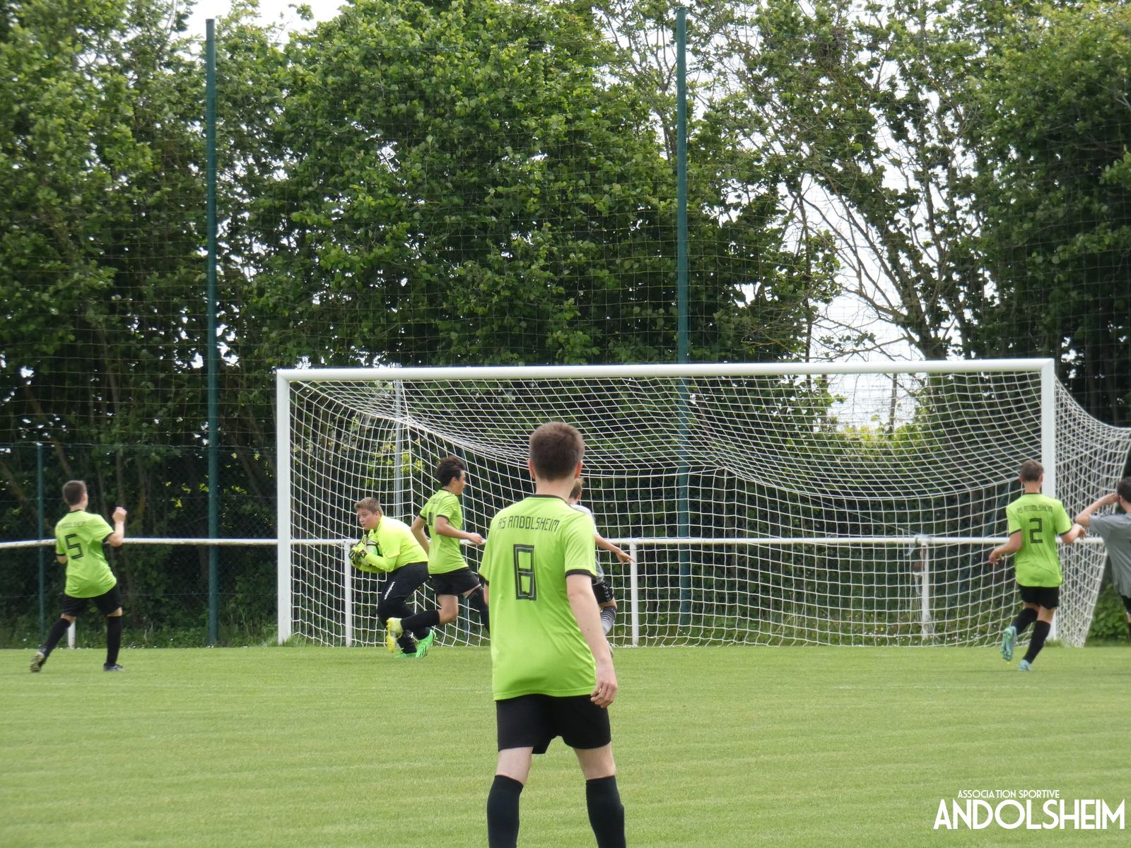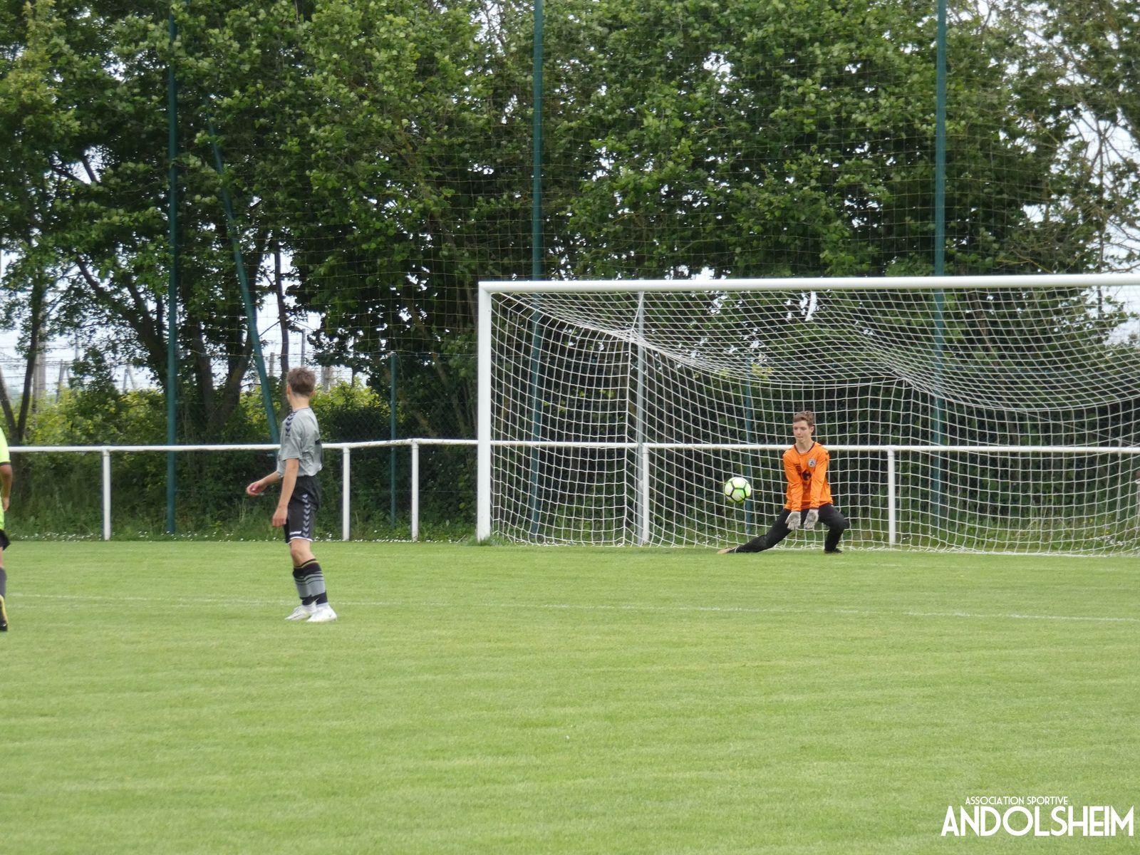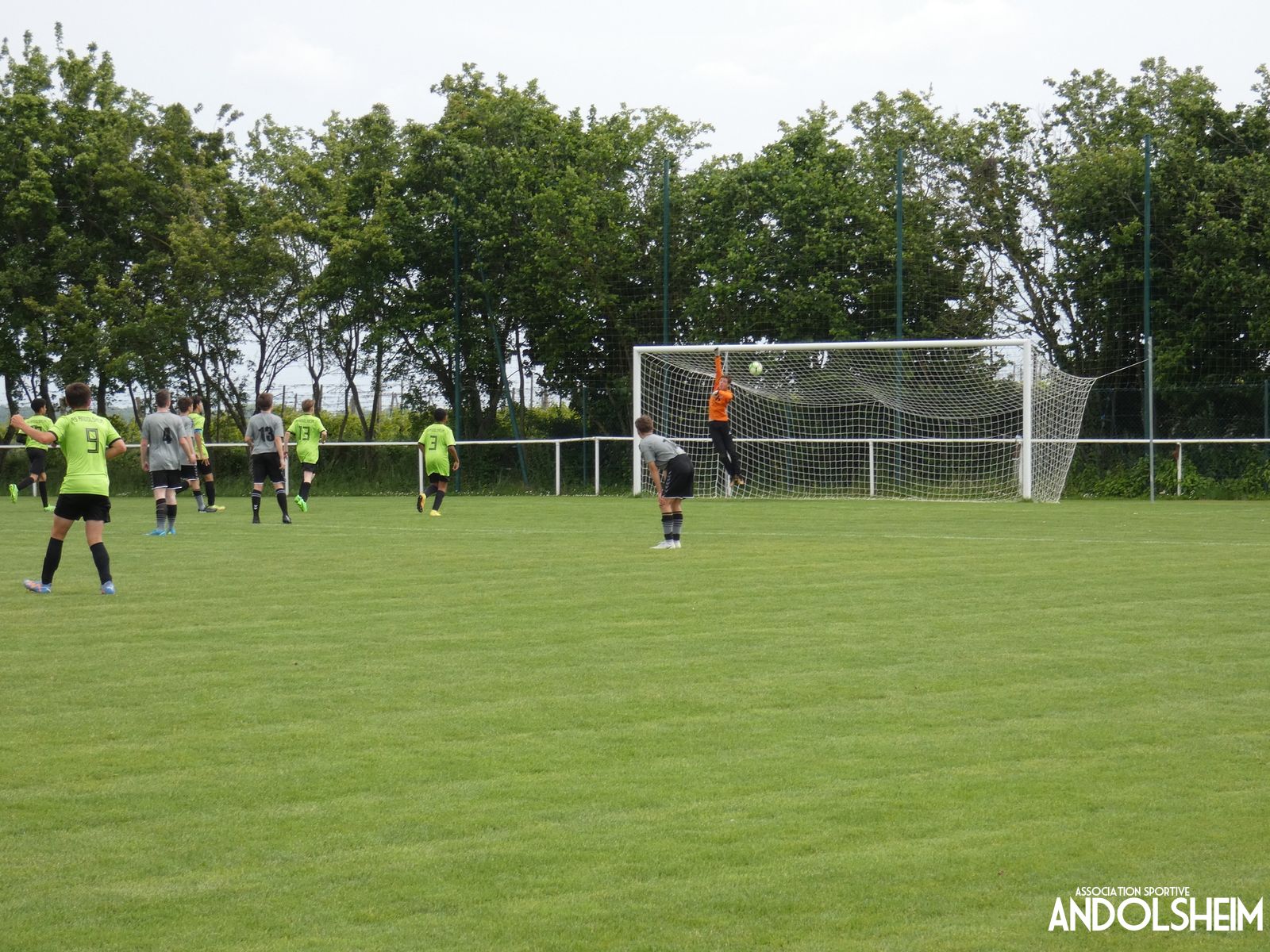 L’effectif est légèrement remanié, on constate le retour d’Anthony qui était blessé et deux remplaçants sur le banc de touche. Nos « Verts » sont bien en place en ce début de rencontre et essaient de construire du beau jeu de suite. Dès la cinquième minute, c’est la première alerte « grise » mais Valentin, notre portier semble bien attentif dans sa surface et gagne son duel face au « n° 9 ». Le jeu est équilibré et les occasions surviennent des deux côtés. Nos adversaires obtiennent un pénalty sur une sortie de notre portier à la 16ième. Valentin part du bon côté mais la balle file dans la lucarne. 1 à 0. Malgré le score, nos jeunes pousses ont de plus en plus la possession de la balle. Notre milieu de terrain lance à plusieurs reprises Anthony dans son couloir et à la demi-heure de jeu cela paie. Anthony efface le gardien et pousse la balle au fond des filets pour remettre l’équipe dans la course. Un partout, on tient et cela fait plaisir de voir le retour d’un jeu collectif. Encore quelques erreurs dans la transmission car on garde trop le ballon mais l’envie est bien perceptible ! A noter également, deux belles tentatives de Thibaut, la première sur un corner de Justin et la deuxième sur un débordement côté droit. Juste avant la pause suite à une erreur de relance venant de l’arrière gauche, nos Verts remettent en jeu leurs adversaires qui ajustent un beau centre ; une belle reprise sur la ligne de but. Score contre le cours du jeu à la mi-temps 2 à 1.