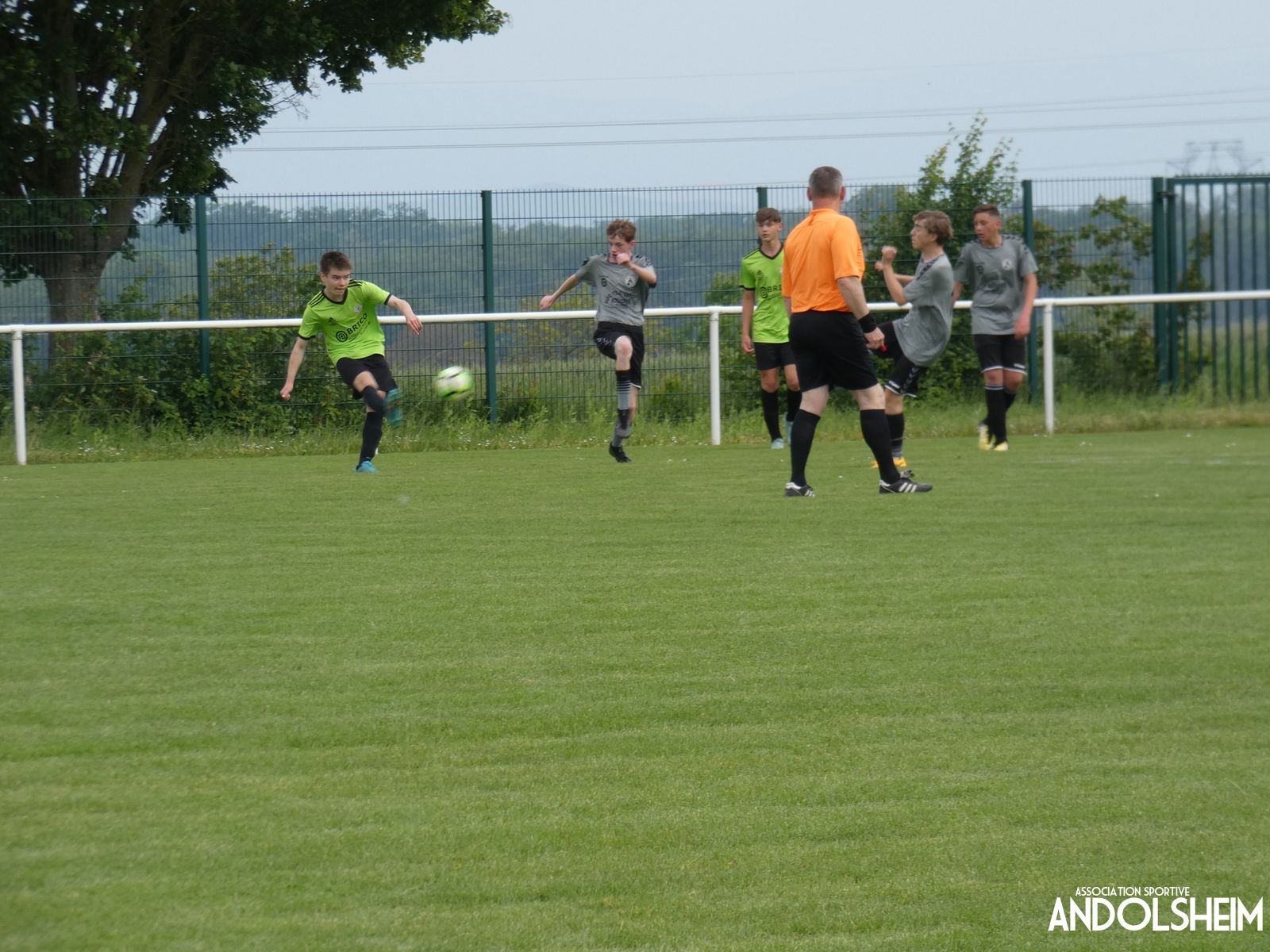 Après l’échauffement de rigueur et une belle entrée des joueurs, l’arbitre officiel siffle le coup d’envoi. On remercie également, Olivier le papa de Justin qui a encore officié, au pied levé, en tant que juge de touche pour ce match. Encore un match Olivier et le diplôme sera bien acquis! Mention « Merci pour les jeunes » !