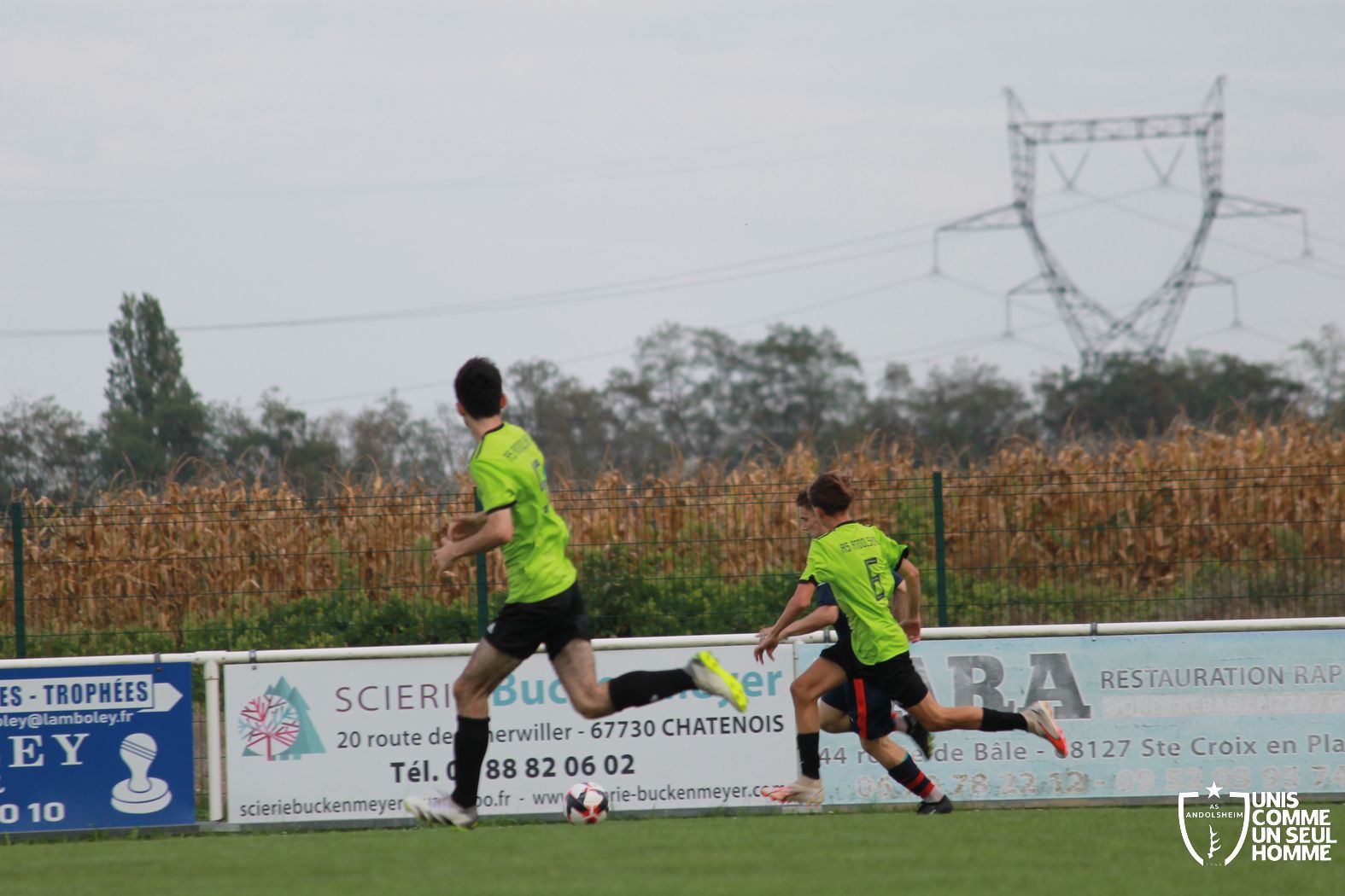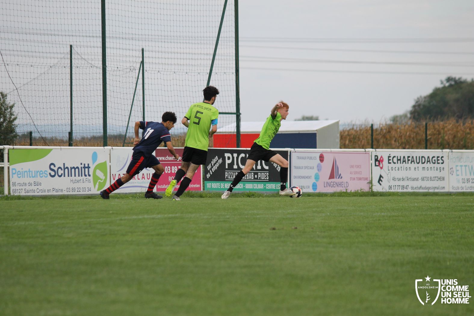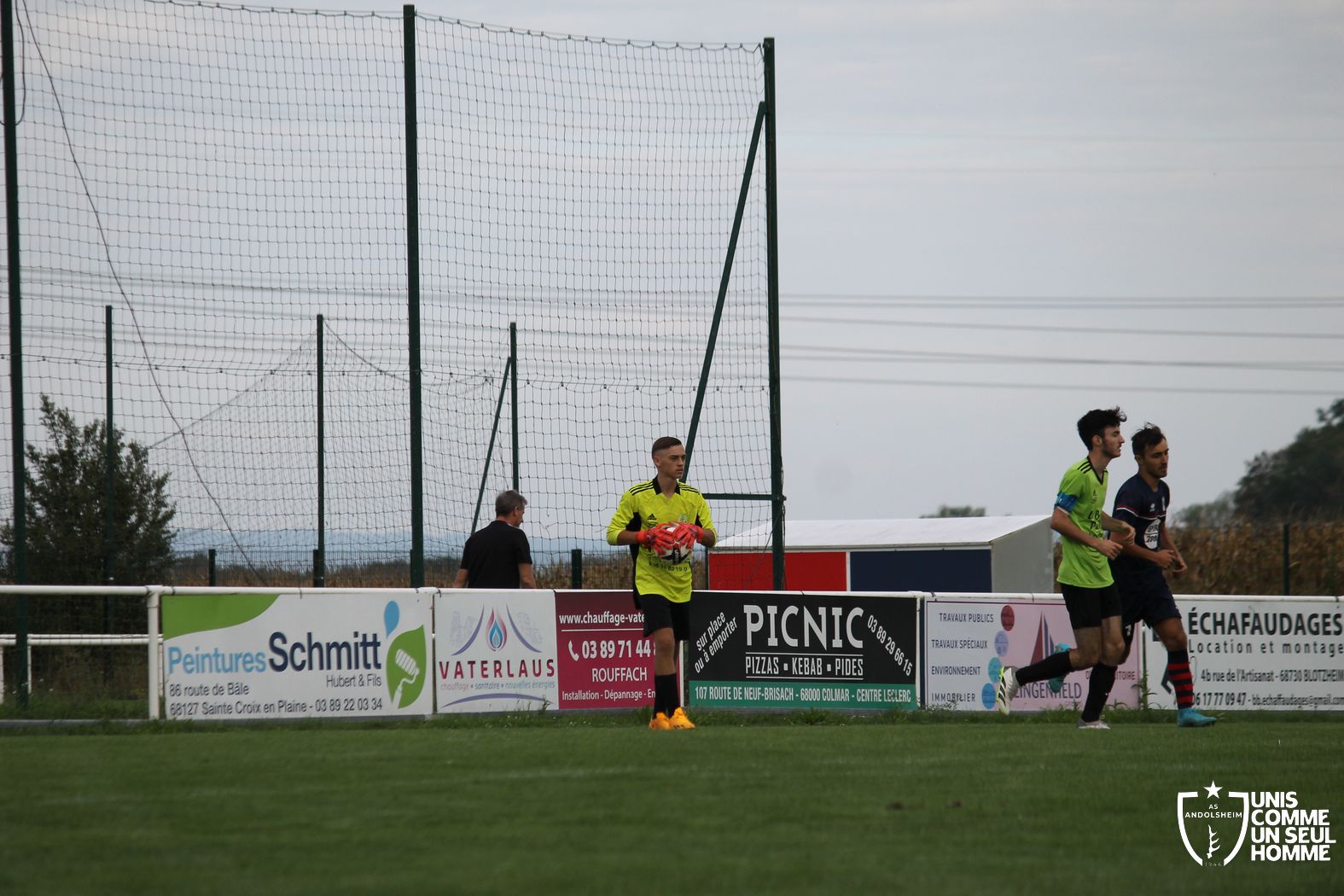 Comme il était prévisible, c’est bien Sainte-Croix-en-Plaine qui domine cette première mi-temps avec plusieurs occasions. Mais nos verts ne se sont pas laissé impressionner. Ils ont eu un esprit combatif, de solidarité et on réussi à contenir les assauts de leurs adversaires. Le pressing des avants et des milieux ont aidé une défense solide qui a fait un bon nombre d'aller-retour pour empêcher que le dernier geste des adversaires fasse mouche.