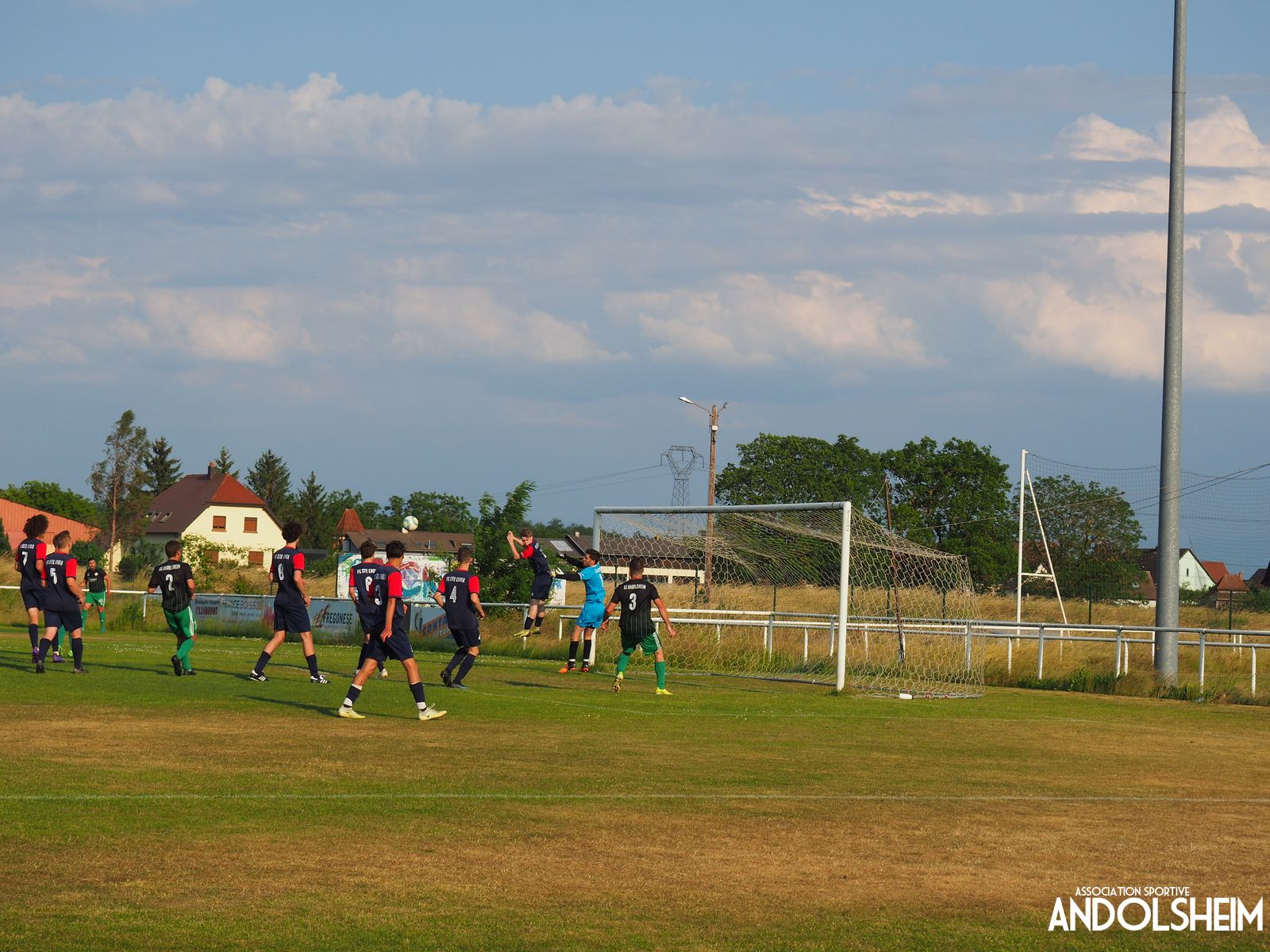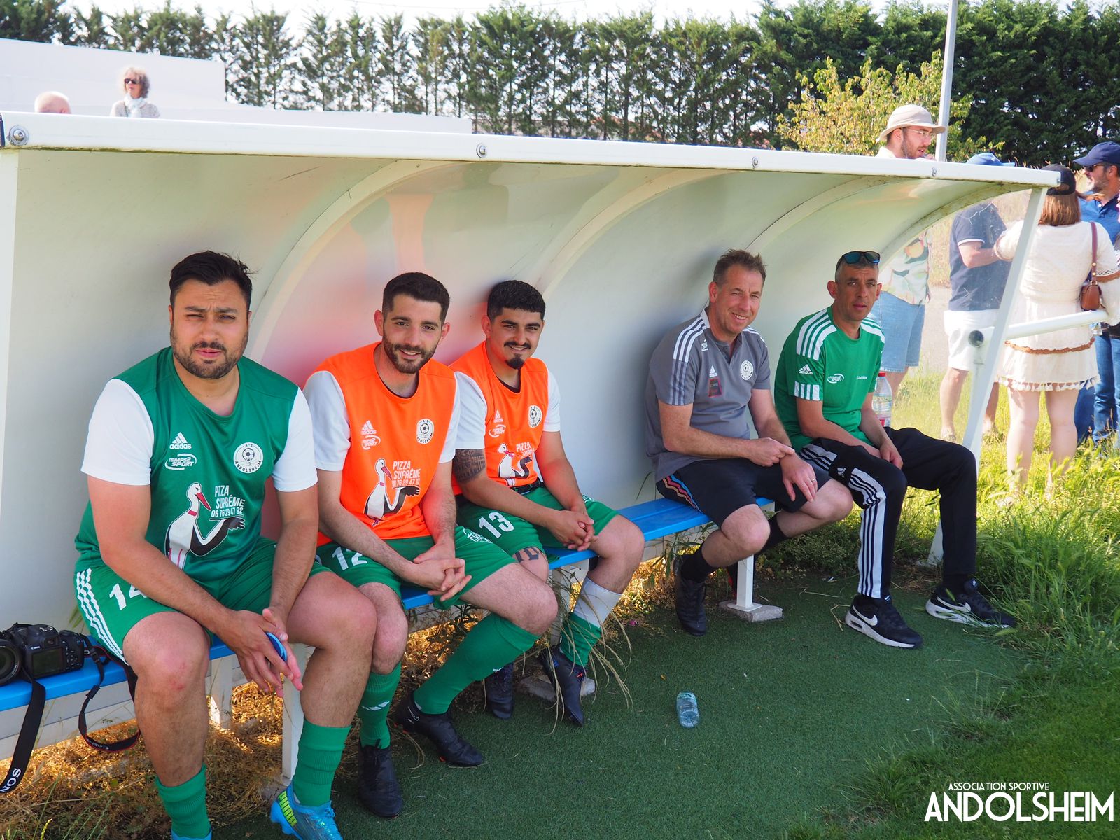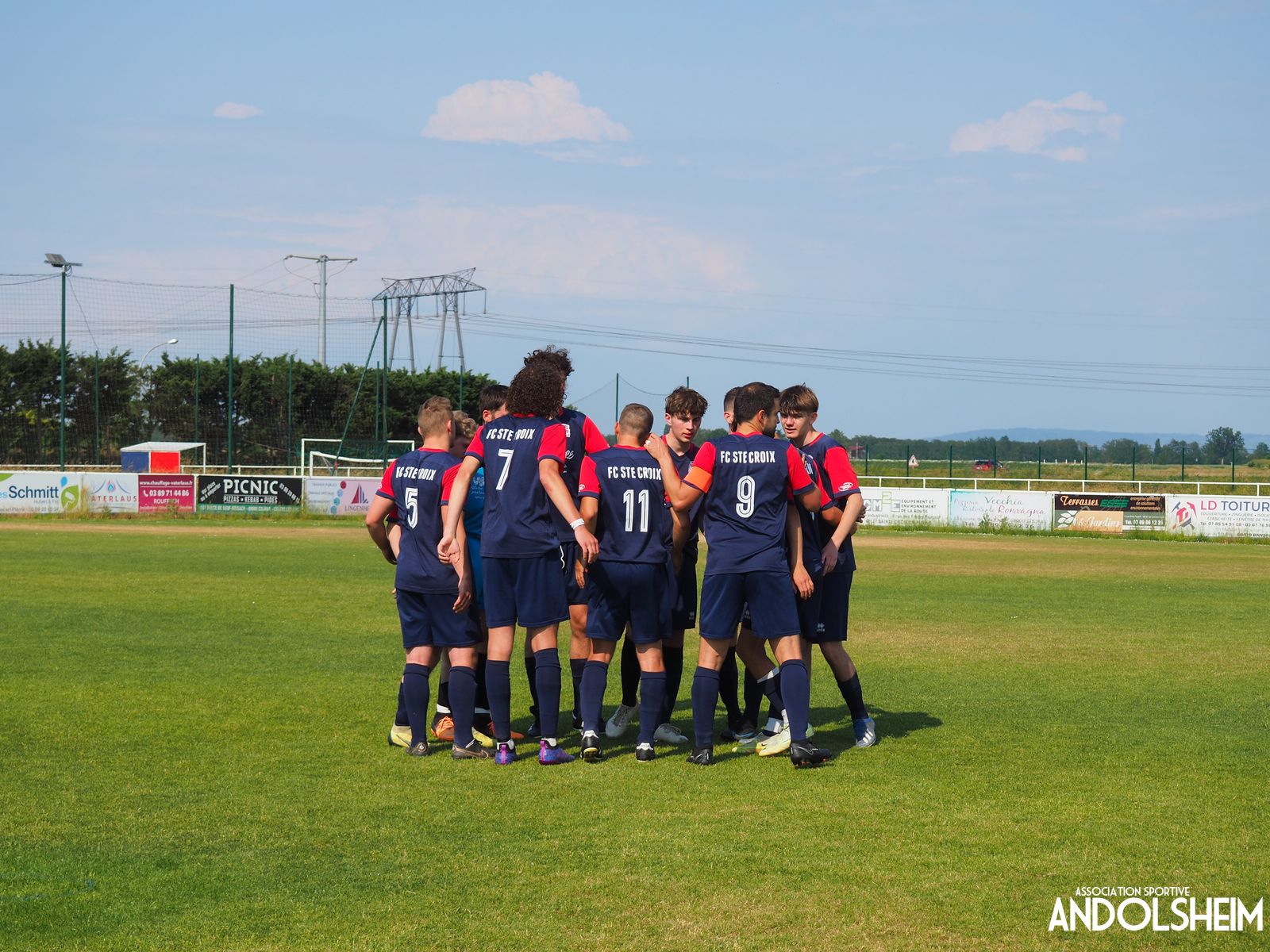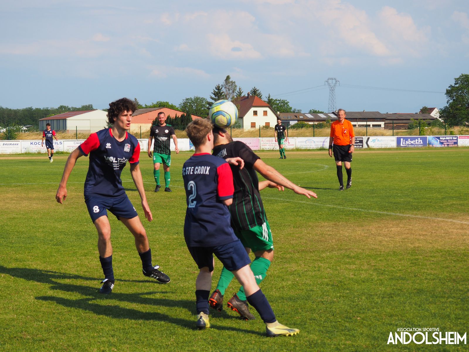 Dès la reprise, les locaux égalisent : deux partout ! À la 55e grosse frayeur, mais Jeff, encore lui, repousse le danger du pied. Deux minutes plus tard, l’ASA prend une seconde biscotte jaune et il y en aura 5 en tout… Bon, les gars, essayez de collectionner les goals, pas les toasts ! Les 2 concepts viennent d’Angleterre, mais on préfère les goals ! À la 65e minute, "Dalep", le dirigeant de la une, qui vient de rentrer sous les clameurs de la foule, lobe et marque : délire total ! L’ASA mène 2 à 3. Mais Andolsheim est incapable de tenir un score en ce dimanche complètement fou : les bleus et rouges égalisent deux minutes plus tard. Tout est à refaire… Dix minutes supplémentaires passent et les locaux marquent contre leur camp en reprenant de volée un centre de Gabin. Merci à nos hôtes ! Mais Monsieur est trop bon : vexés d’avoir marqué contre leur camp, les croisés marquent contre le nôtre 4 minutes plus tard : rira bien qui égalisera le dernier ! Quatre partout, score final, merci à Ste Croix, félicitations à eux, bonne continuation aux deux formations… Et chaleureux remerciements aux bénévoles de Ste Croix en Plaine, pour leur accueil et leur gentillesse en 3e mi-temps.