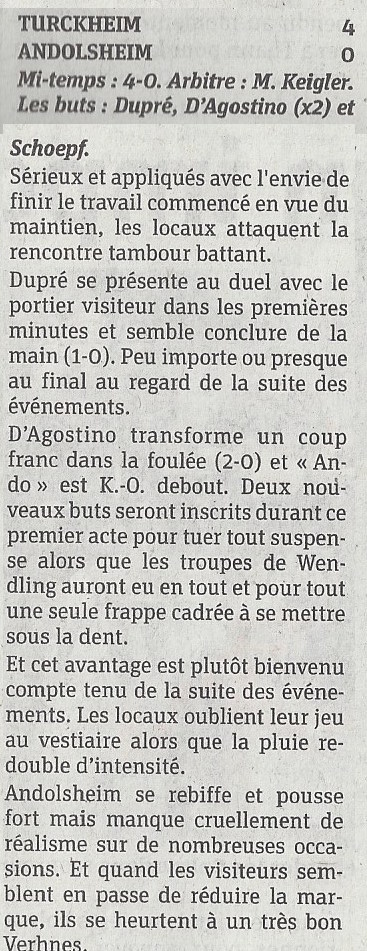 Si perdre n'est pas un drame en soit quand la défaite est logique ...autant hier après midi les coéquipiers du capitaine Faros peuvent avoir de la frustration de ne pas avoir pu maîtriser le cours de la partie suite à deux erreurs grossières arbitrales en début de partie pour autant de buts encaissés ... De quoi etre en colère et vous mettre la tête à l'envers ...puis comme la meilleure défense pour le responsable au sifflet se fût l'attaque, il continua son show privant de banc de touche l'encadrement complet des verts ...bref la messe était dite et on se consolera d'assister à une deuxième mi temps d'un match déjà plié en constatant que l'équipe continua à se procurer des occasions sans concéder de but ...occasions qu'il ne faudra pas gâcher à Gunsbach.
