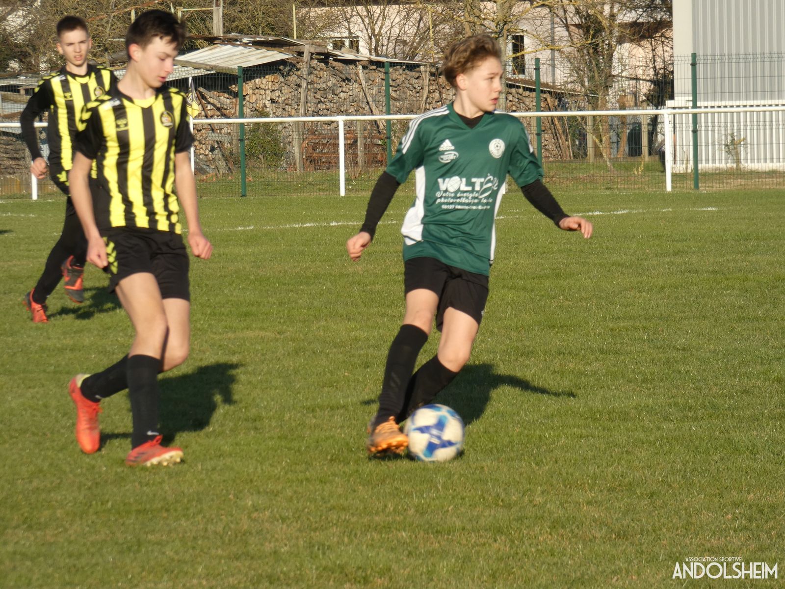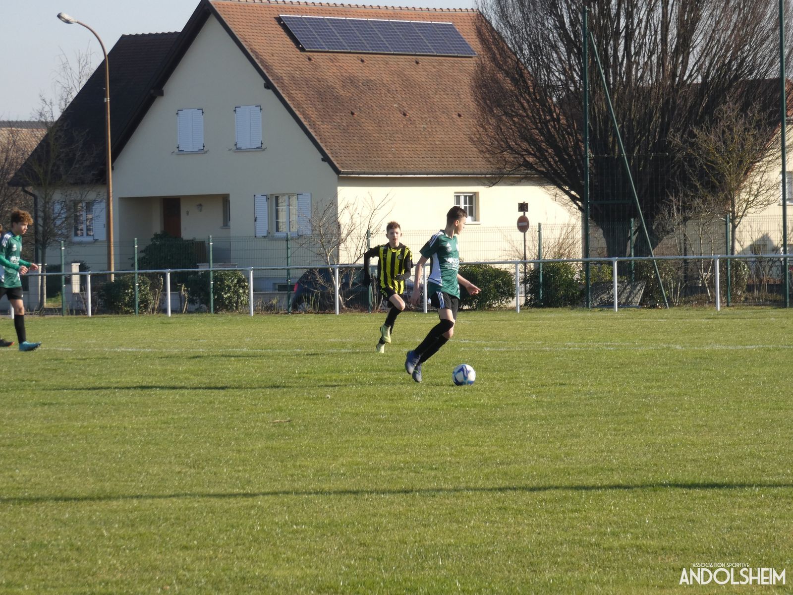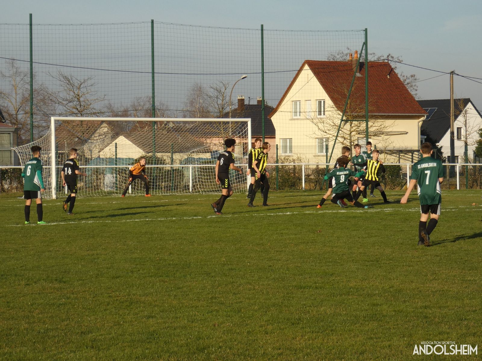 Après l’échauffement de rigueur, l’arbitre local siffle le coup d’envoi. Une belle entame de match pour nos Verts qui ont à cœur de garder la maitrise de la balle. Anthony et Ewan, sur leur coté respectif, donnent du travail à la défense « Noire et Jaune » lorsque nos milieux distribuent de beaux ballons. L’ASA ouvre donc logiquement le score à la 10ieme minute grâce à Yanis sur un beau tir croisé. Mais au fil du temps, nos « Verts » se gênent de plus en plus et n’occupent plus si bien l’espace ; ce qui donne plusieurs occasions de contre-offensives à l’adversaire. Louis est bien en place sur sa ligne, et malgré tout, les ballons finissent par rentrer. Les « Noirs et Jaunes » reviennent au score et prennent même l’avantage quelques minutes plus tard.