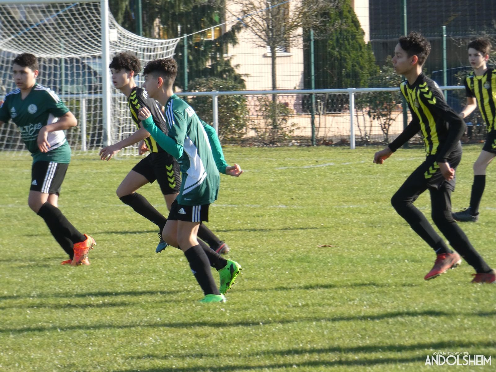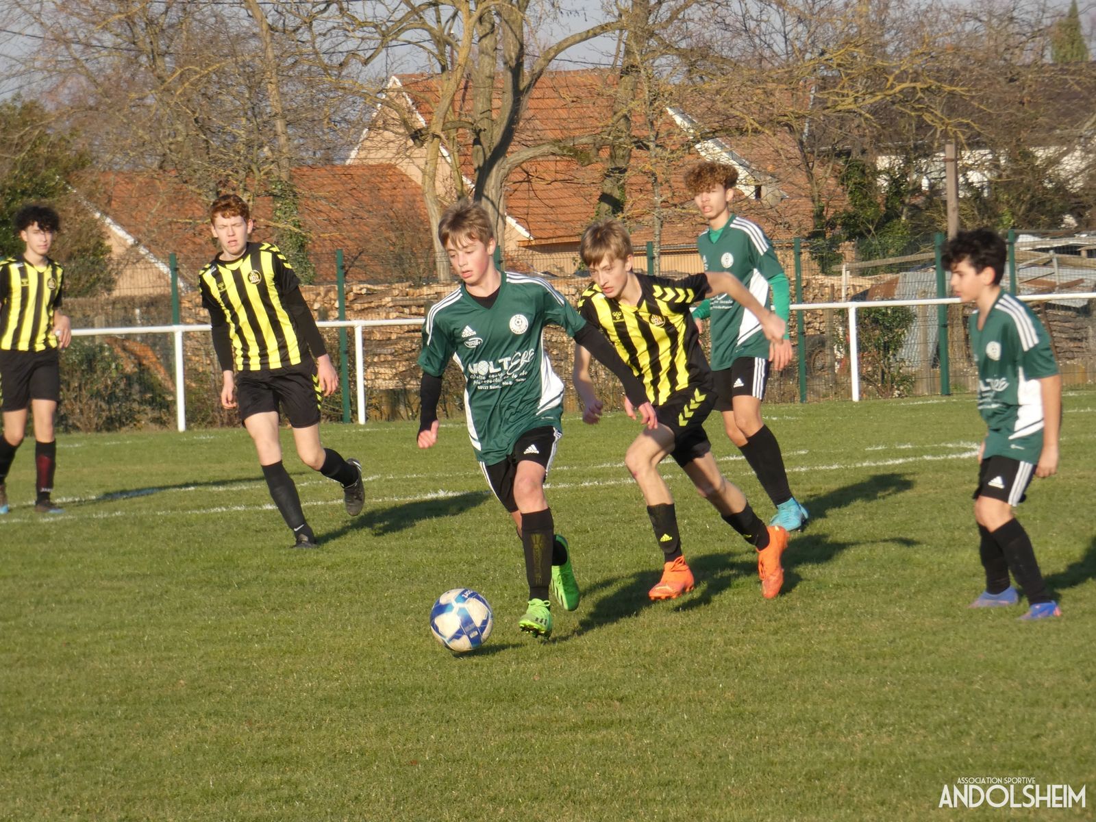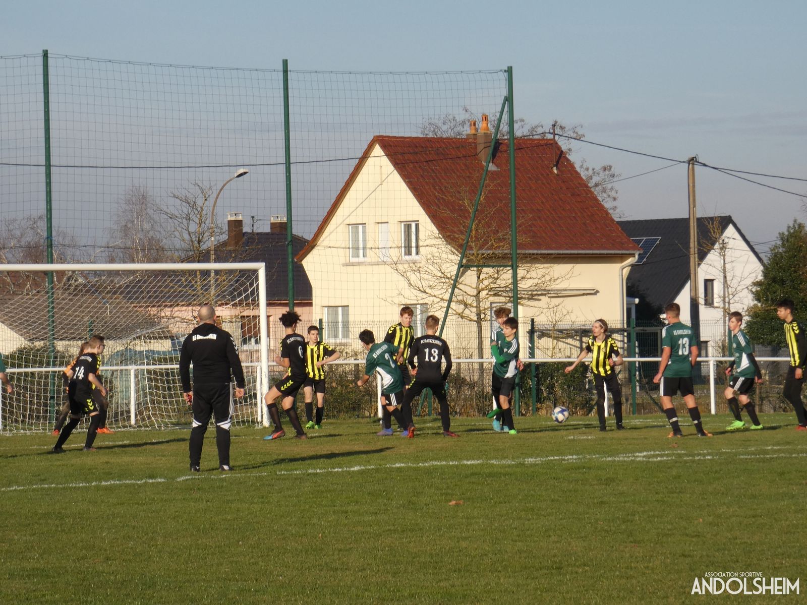 Après l’échauffement de rigueur, l’arbitre local siffle le coup d’envoi. Une belle entame de match pour nos Verts qui ont à cœur de garder la maitrise de la balle. Anthony et Ewan, sur leur coté respectif, donnent du travail à la défense « Noire et Jaune » lorsque nos milieux distribuent de beaux ballons. L’ASA ouvre donc logiquement le score à la 10ieme minute grâce à Yanis sur un beau tir croisé. Mais au fil du temps, nos « Verts » se gênent de plus en plus et n’occupent plus si bien l’espace ; ce qui donne plusieurs occasions de contre-offensives à l’adversaire. Louis est bien en place sur sa ligne, et malgré tout, les ballons finissent par rentrer. Les « Noirs et Jaunes » reviennent au score et prennent même l’avantage quelques minutes plus tard.