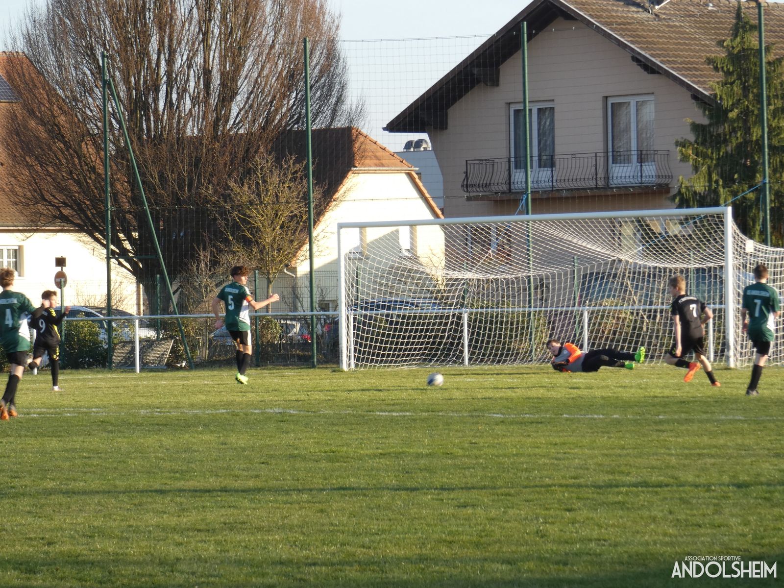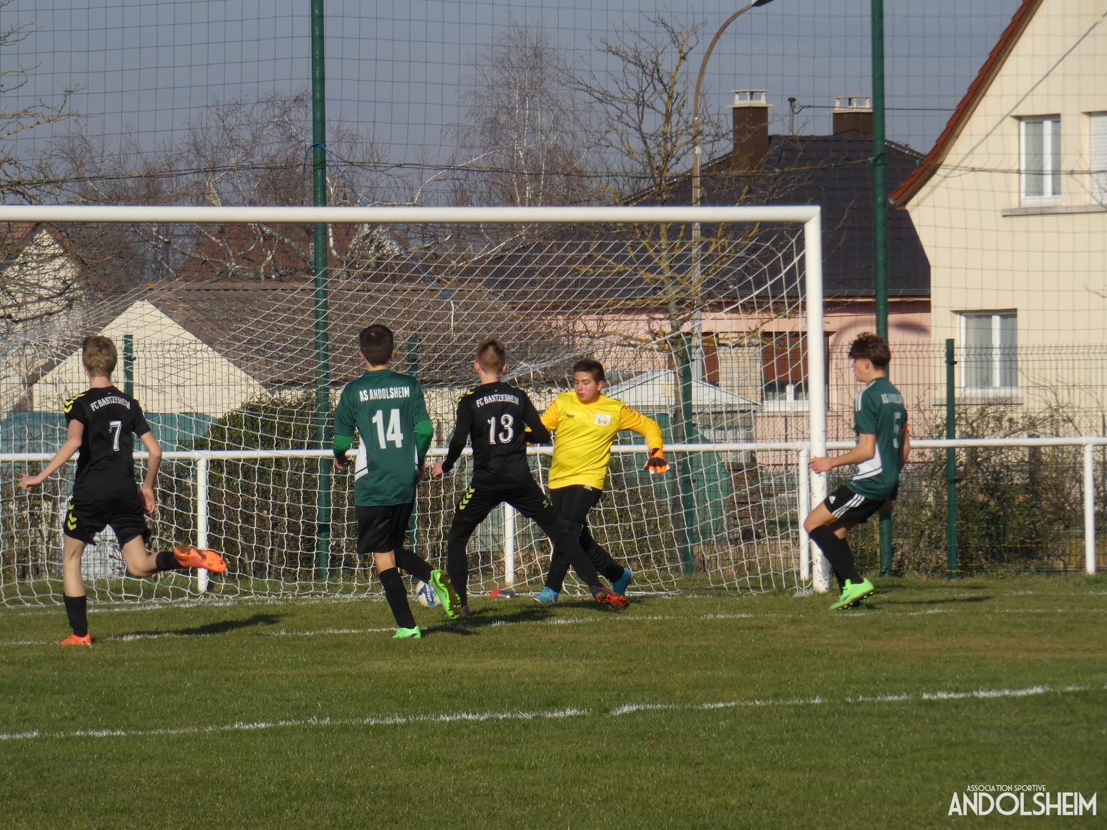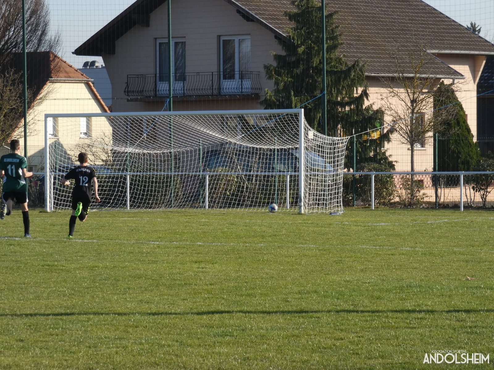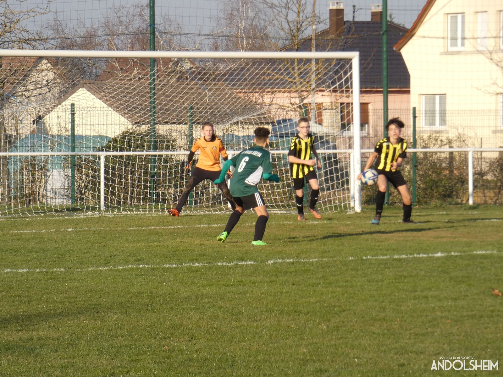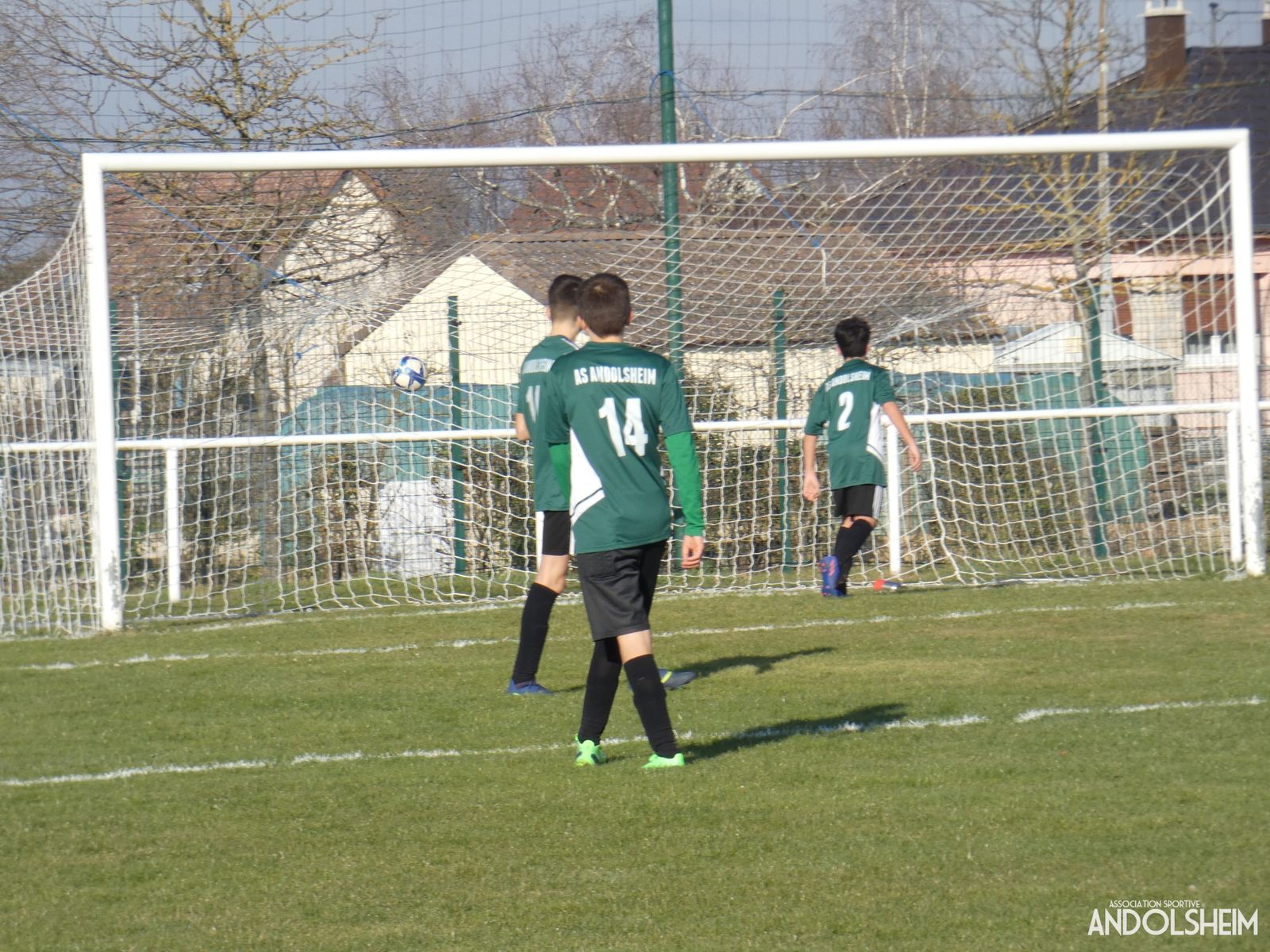Des erreurs de relance et des passes approximatives en sont la cause. Le jeu a du mal à s’écarter et on ne profite pas assez de la vitesse de nos ailiers. Mais nos jeunes sont présents sur les duels et continuent dans l’effort et cela paie ! Juste avant la mi-temps, Anthony déborde sur son coté gauche et ajuste une belle frappe croisée des 18 mètres.