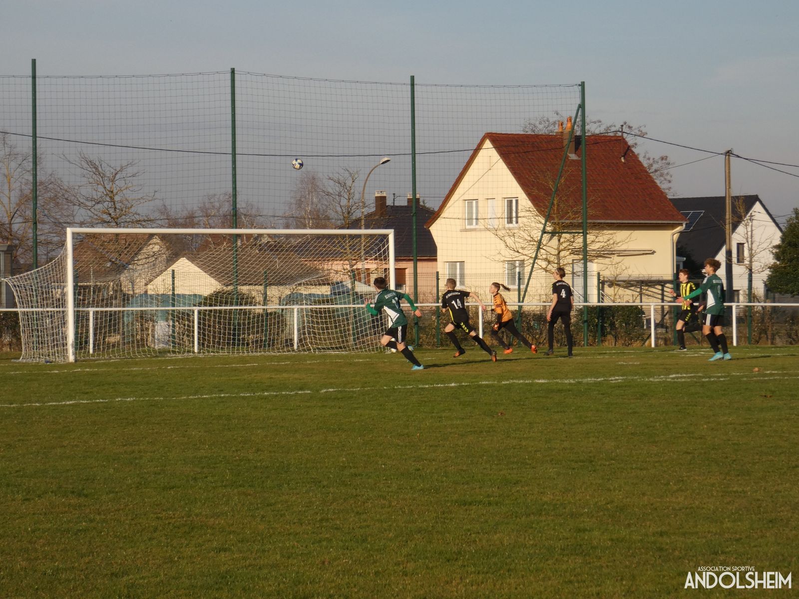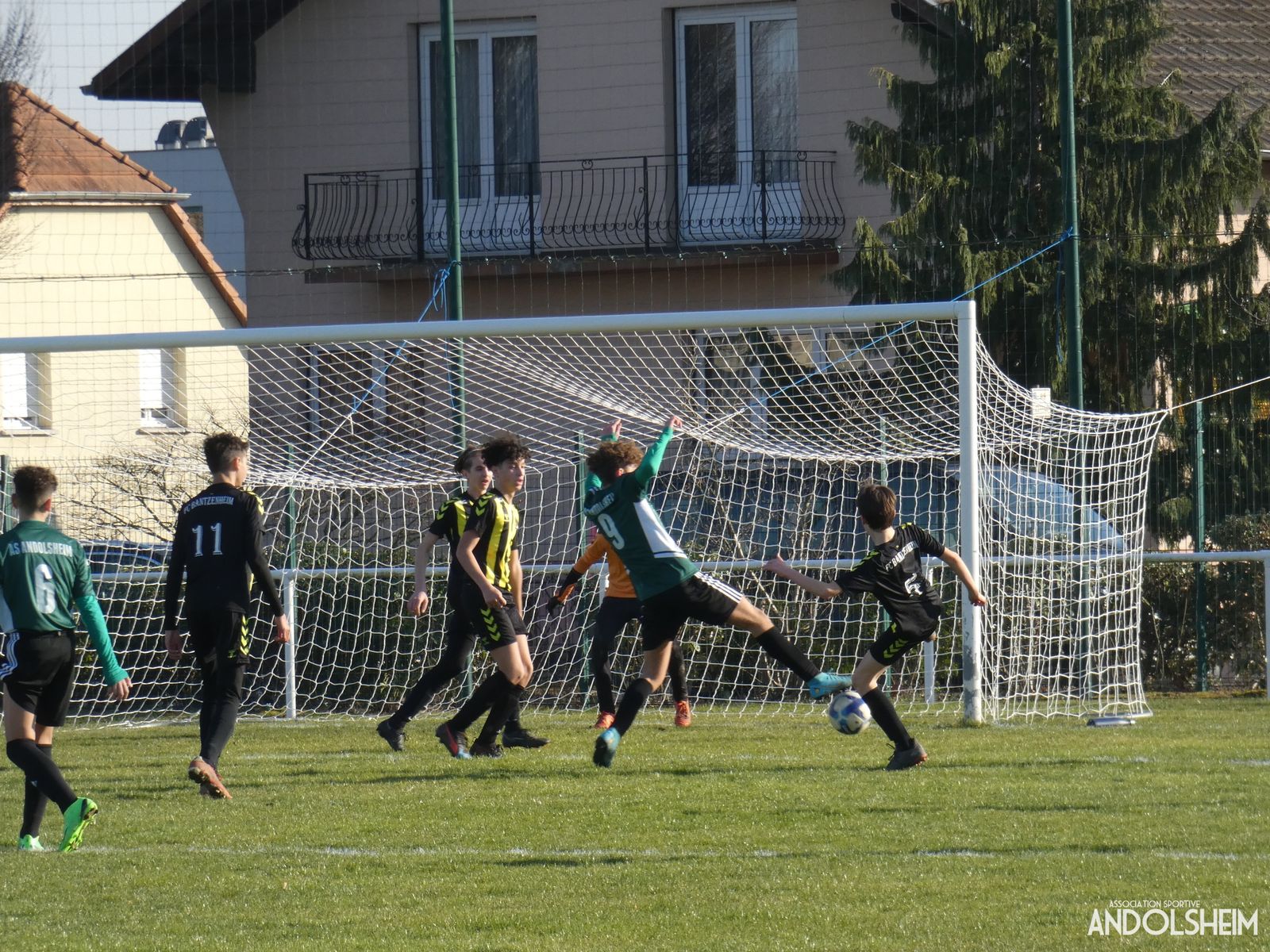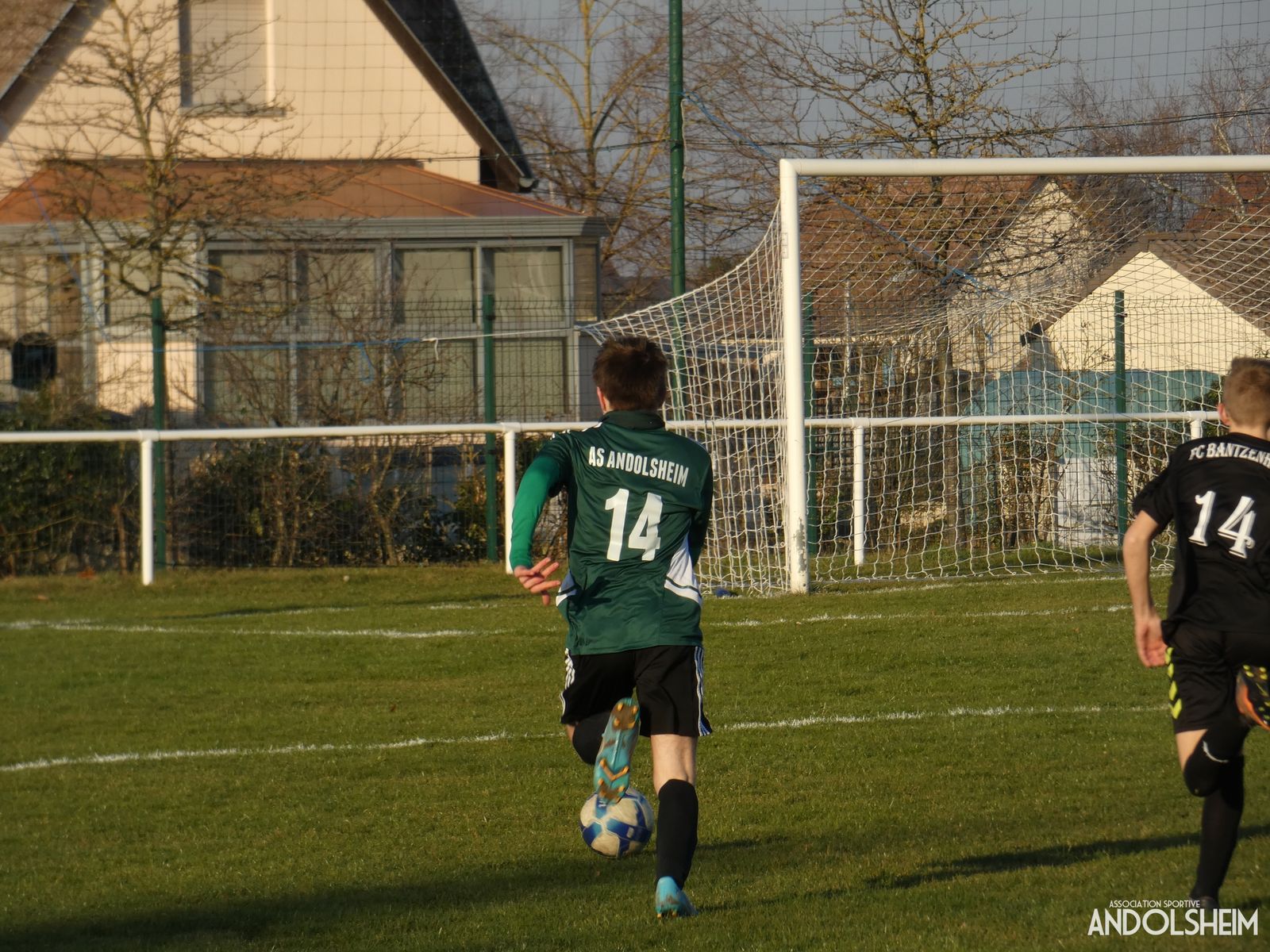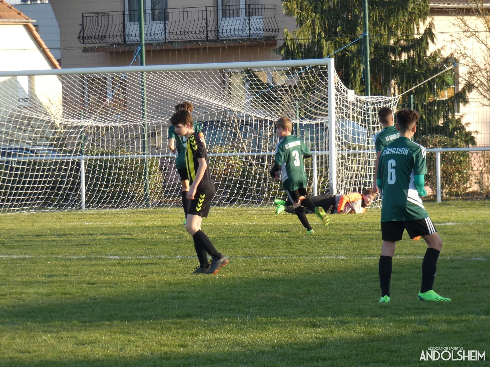 Des erreurs de relance et des passes approximatives en sont la cause. Le jeu a du mal à s’écarter et on ne profite pas assez de la vitesse de nos ailiers. Mais nos jeunes sont présents sur les duels et continuent dans l’effort et cela paie ! Juste avant la mi-temps, Anthony déborde sur son coté gauche et ajuste une belle frappe croisée des 18 mètres.