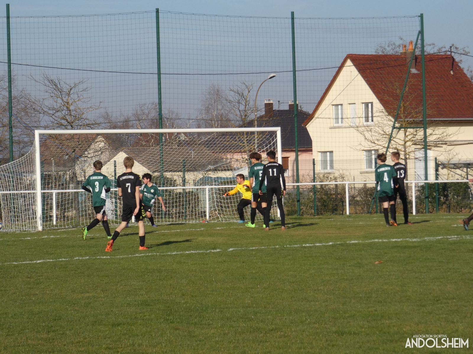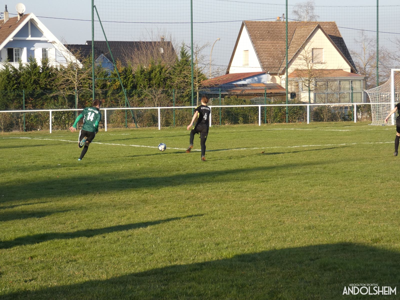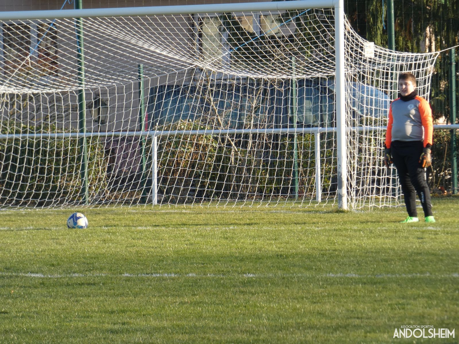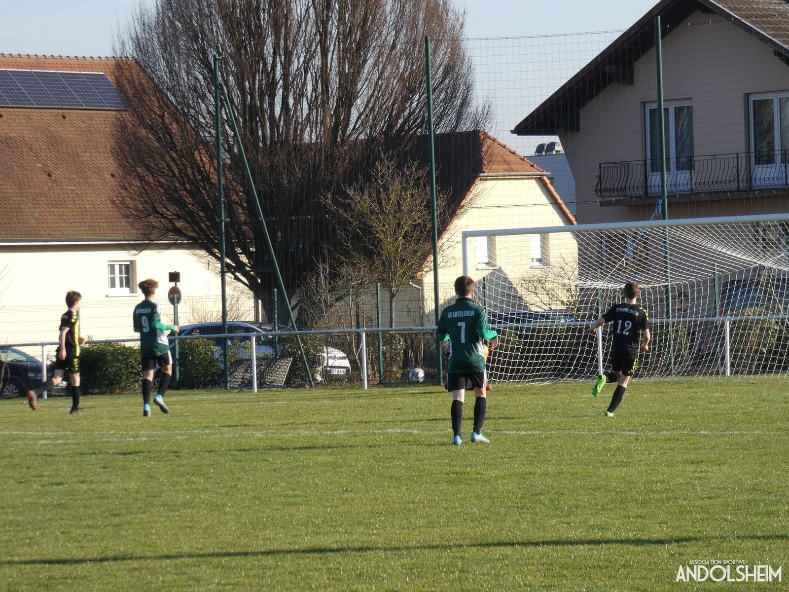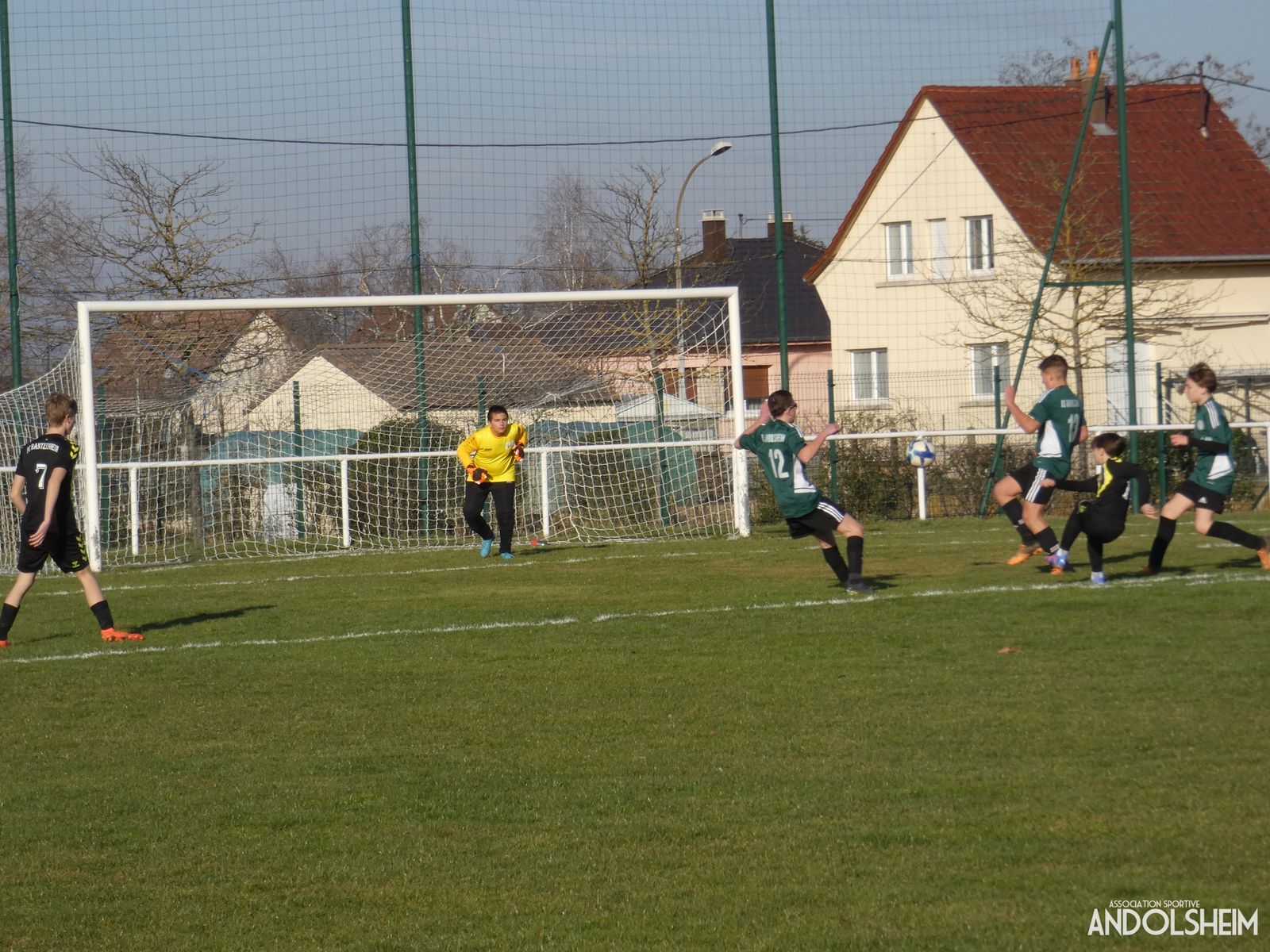 Des erreurs de relance et des passes approximatives en sont la cause. Le jeu a du mal à s’écarter et on ne profite pas assez de la vitesse de nos ailiers. Mais nos jeunes sont présents sur les duels et continuent dans l’effort et cela paie ! Juste avant la mi-temps, Anthony déborde sur son coté gauche et ajuste une belle frappe croisée des 18 mètres.