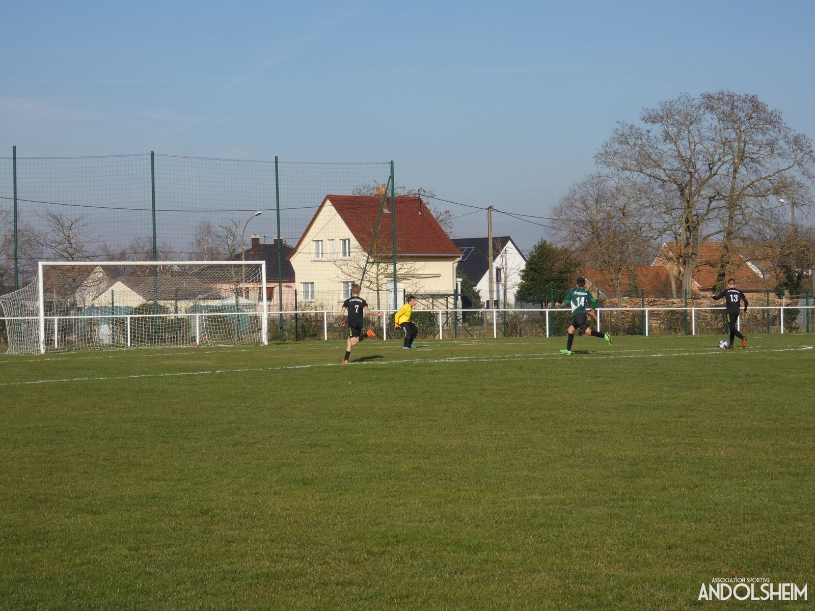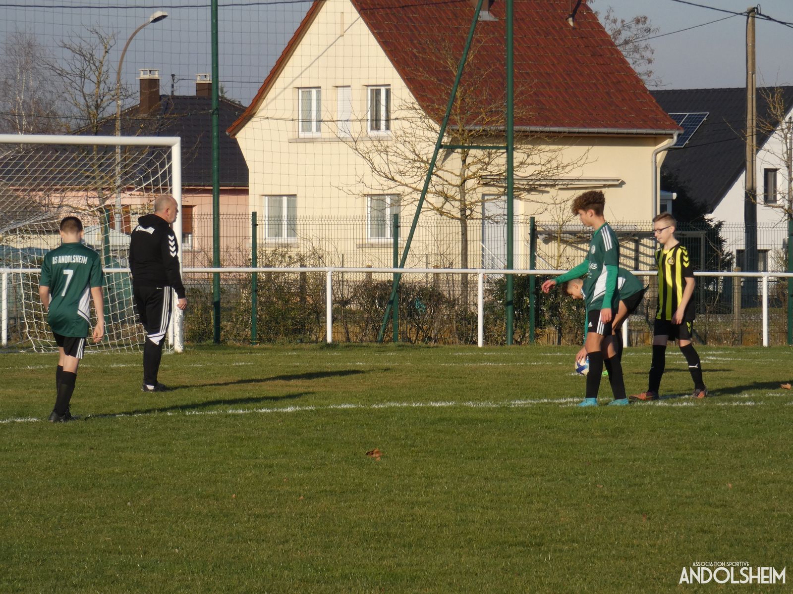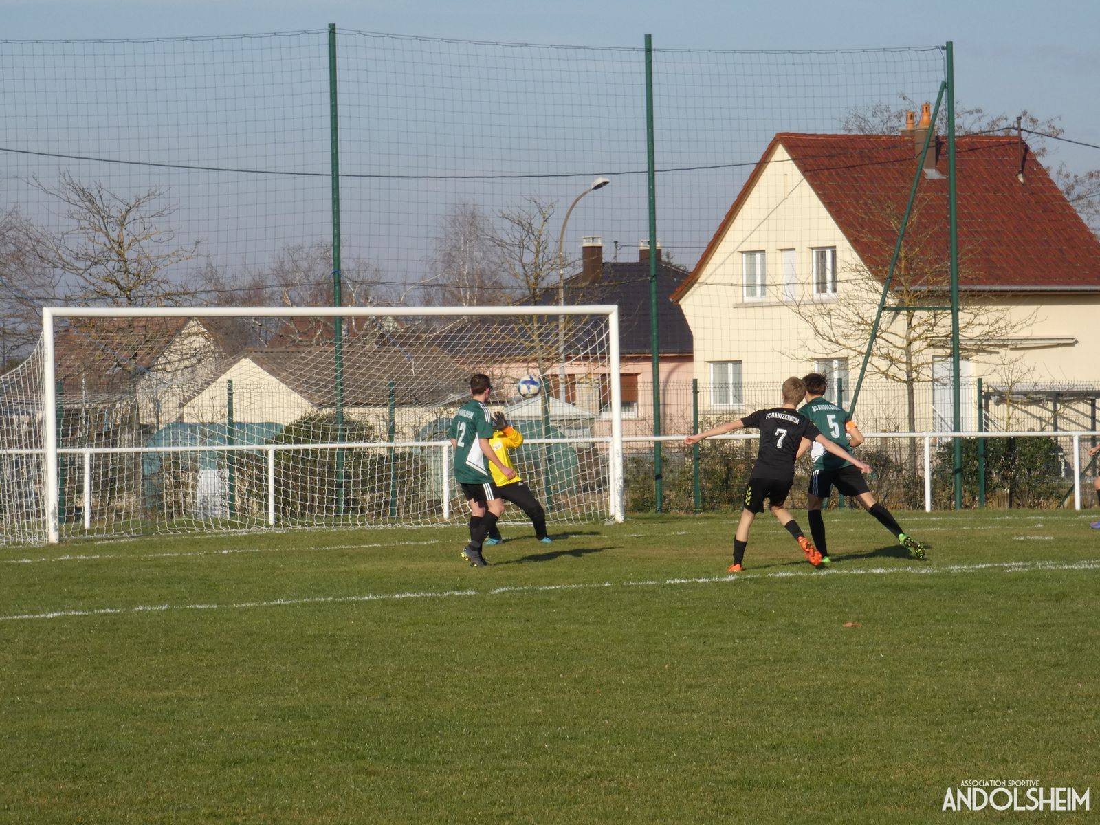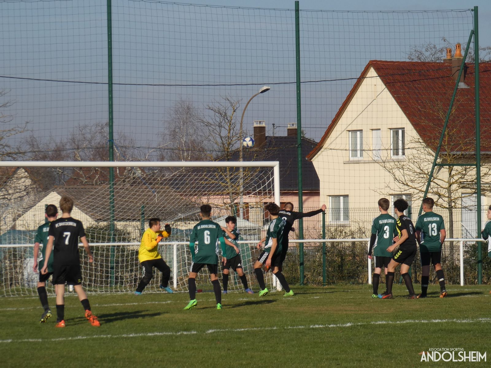 Des erreurs de relance et des passes approximatives en sont la cause. Le jeu a du mal à s’écarter et on ne profite pas assez de la vitesse de nos ailiers. Mais nos jeunes sont présents sur les duels et continuent dans l’effort et cela paie ! Juste avant la mi-temps, Anthony déborde sur son coté gauche et ajuste une belle frappe croisée des 18 mètres.