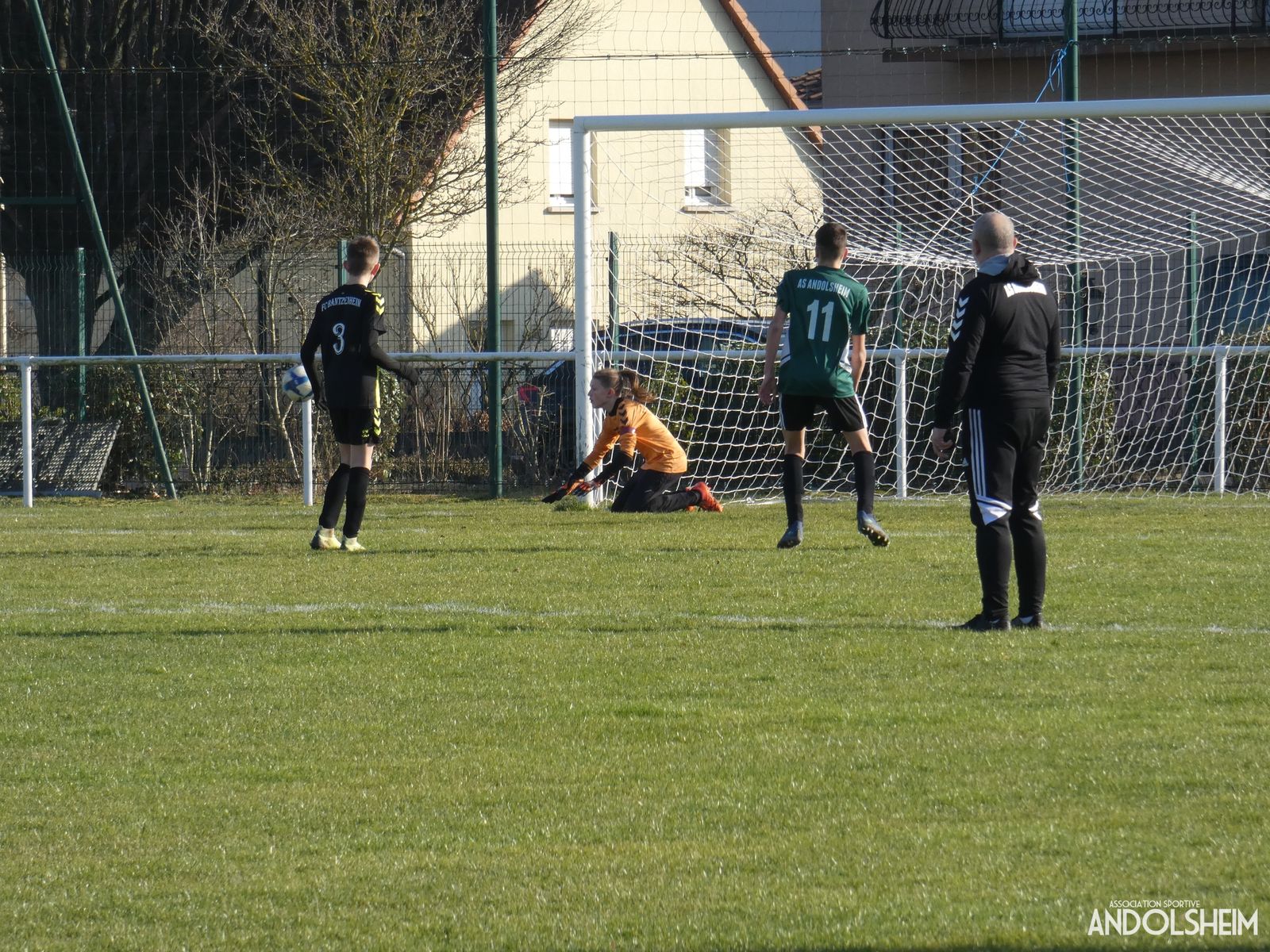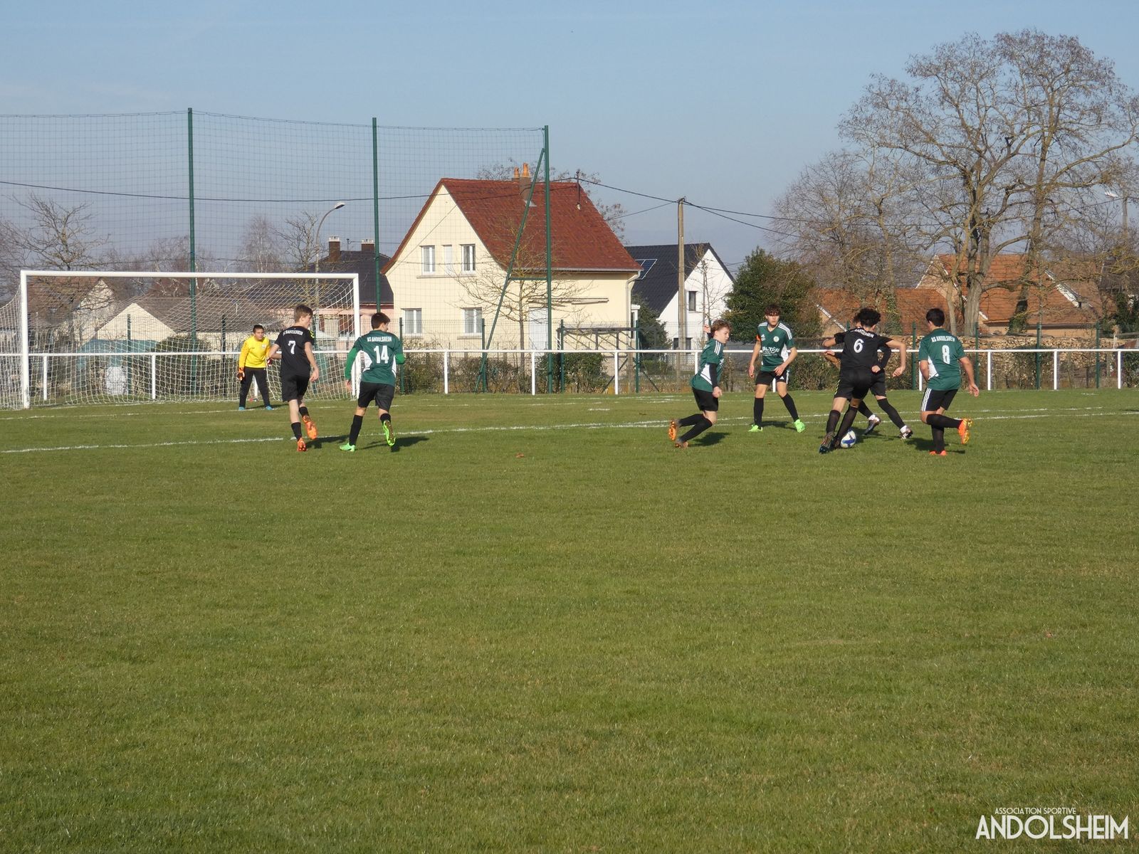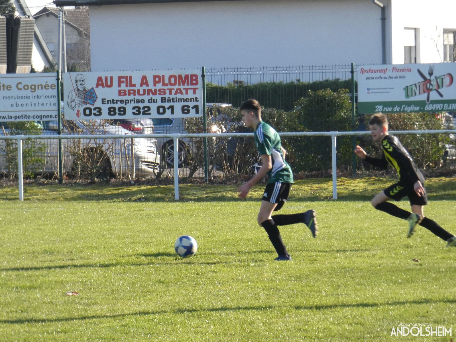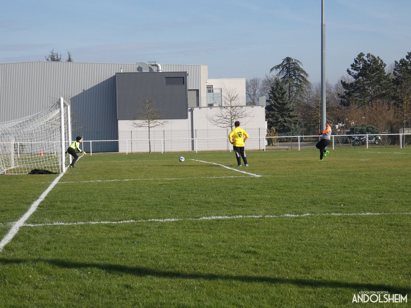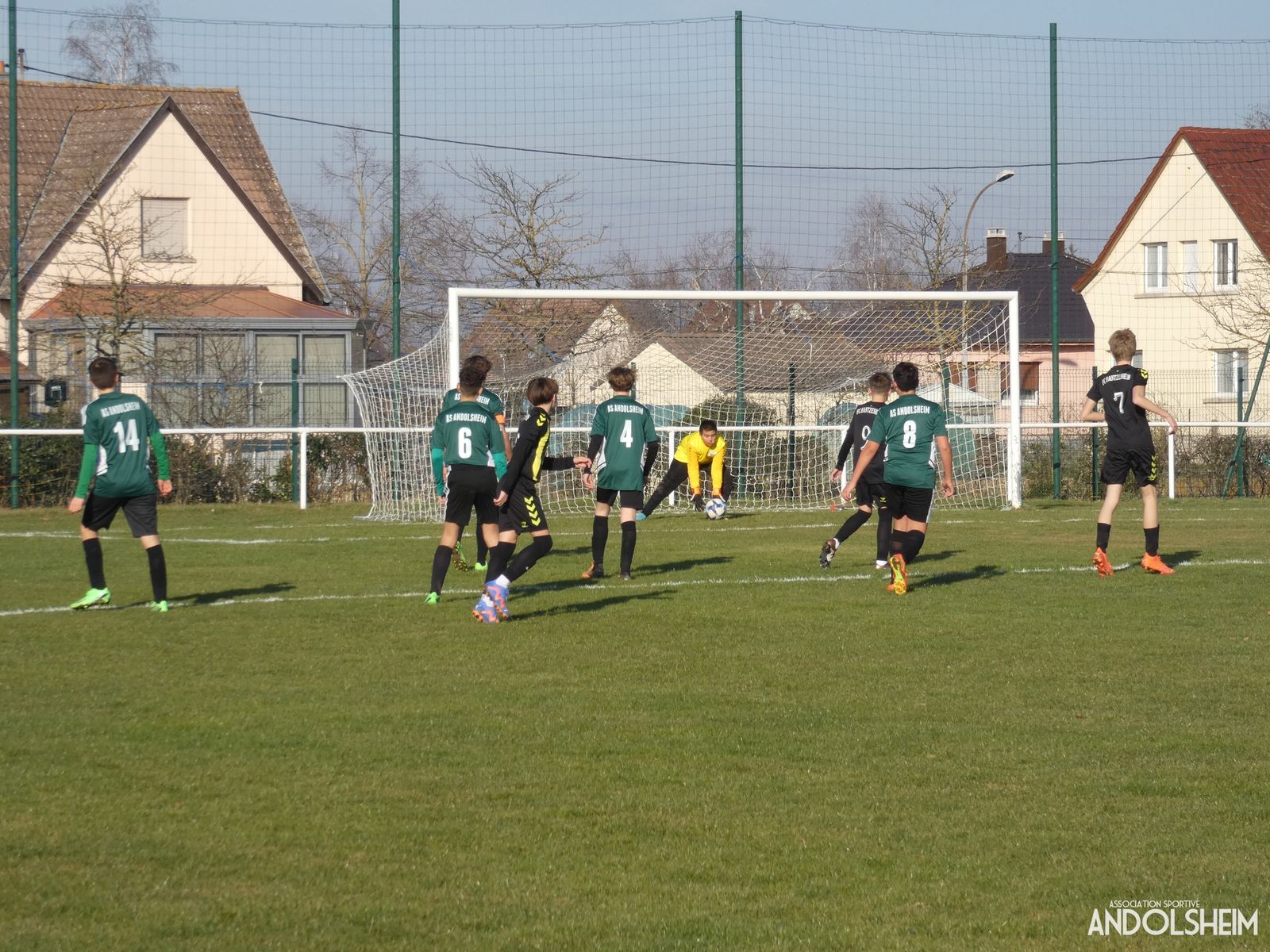 Des erreurs de relance et des passes approximatives en sont la cause. Le jeu a du mal à s’écarter et on ne profite pas assez de la vitesse de nos ailiers. Mais nos jeunes sont présents sur les duels et continuent dans l’effort et cela paie ! Juste avant la mi-temps, Anthony déborde sur son coté gauche et ajuste une belle frappe croisée des 18 mètres.