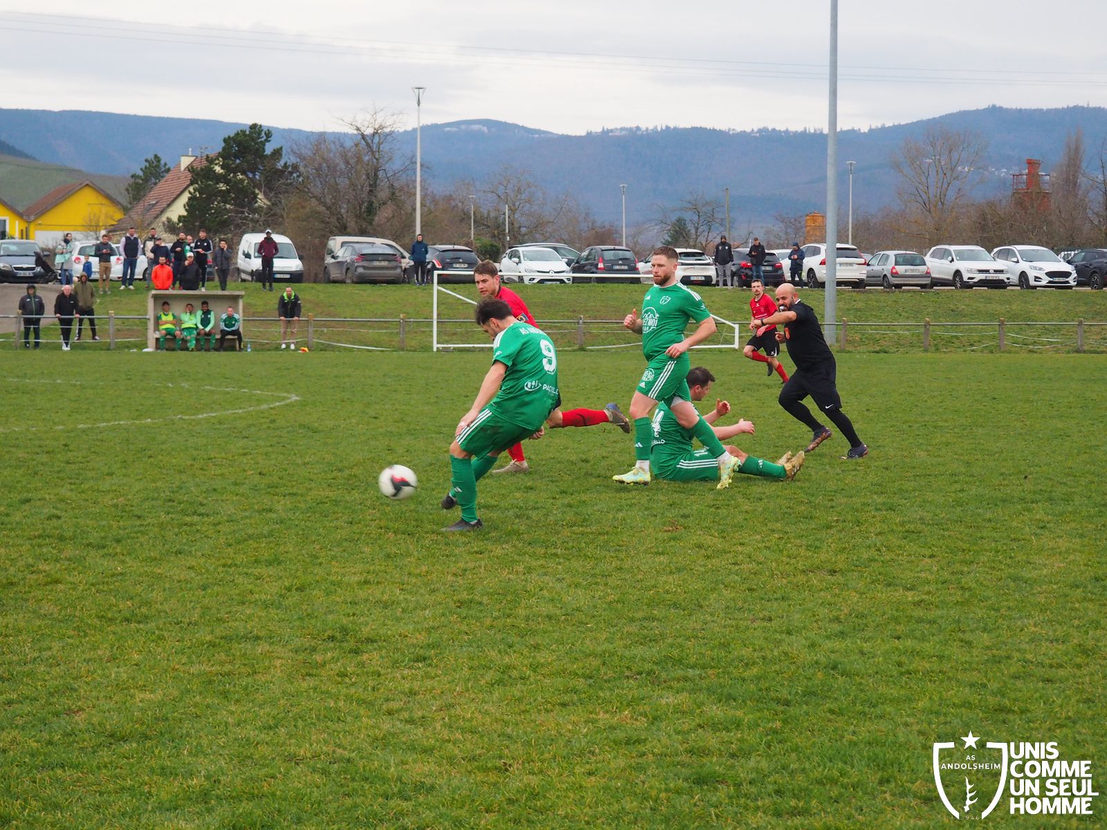 En ce dimanche grisâtre et doux, notre équipe fanion rend visite au beau village viticole de Wettolsheim. Gillou, Jérôme, Christophe, assurent respectivement le coaching, la tablette et la touche. Dalep renforce de nouveau notre équipe journalistique, il assure la partie photographique du reportage Facebook. Le président et une partie du comité nous rejoignent à la pause, de retour de la Meinau. Justement, cinq minutes avant la pause, Josh s’en va sur l’aile gauche, et trouve le filet. Pause, cafés colombiens avec sucre, ou sans, boissons alsaciennes avec houblon, ou avec.