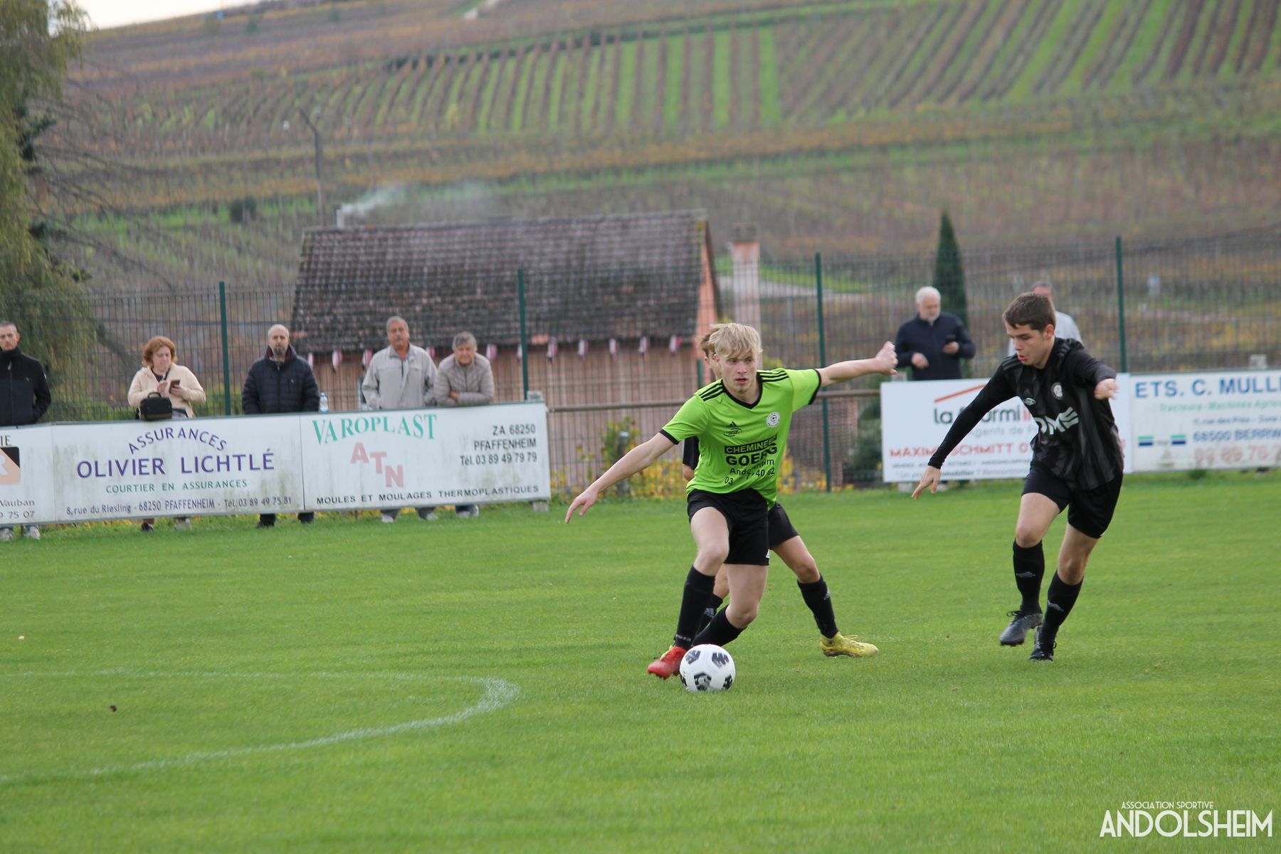En ce samedi automnal, nos U18 équipe une, qui évoluent en D2, se déplacent à Pfaffenheim, pour jouer contre Gundolsheim, puisque les deux villages viticoles sont en entente. Arbitrage officiel irréprochable comme toujours et ligne de touche assurée, coté Andolsheim, par notre Gérard, toujours aussi impartial qu’indispensable. Merci à lui. Dès la neuvième minute un corner permet aux locaux d’ouvrir le score. Défense et gardien mal placés. Ça arrive, c’est pas dramatique. Le coach Michel, secondé par Robert, reste calme et garde son équipe bien motivée. Robert assure également les fonctions de soigneur et de photographe. Si ça s’appelle pas de la disponibilité et de la polyvalence, alors il faut inventer un autre mot, moi j’en ai plus dans mon vocabulaire…ah si, ça s’appelle le bénévolat ! Bref, je discute, mais nos joueurs se battent pendant ce temps-là. Et ça paye : à la 25eme Nathan effectue une contre-attaque éclair sur l'aile gauche et centre sur Kilian, démarqué, qui tire et marque : égalisation pour l’ASA ! Trois minutes plus tard Gundolsheim reprend l’avantage , mais de justesse car Clément a dévié la balle qui décide tout de même de rentrer dans nos filets. Encore 3 minutes passent et cette fois c’est Nathan qui égalise pour l’AS ANDOLSHEIM , sur penalty ! Vous l’avez compris , nous sommes dans la période de folie évoquée en titre : tout spectateur qui cligne des yeux peut rater un but ! Encore dix minutes et les locaux reprennent l’avantage, également sur penalty, et encore, un peu chanceux, puisque Clément a encore plongé du bon côté. Ne clignez pas des yeux, c’est pas fini. Sept minutes plus tard Valentin égalise à trois partout pour l’ASA. Cinq buts en vingt minutes sur la route des vins, ça se fête ! C’est justement ce que pense aussi l’arbitre qui expulse dix minutes un joueur de Gundolsheim pour que la fête puisse continuer dans le fair play et la bonne humeur. A la 70eme Clément nous gratifie d’une magnifique parade sur son côté gauche : on a eu chaud ! Vient la 94eme minute et donc théoriquement la fin du match…mais un dernier coup franc à la limite des 16 mètres est sifflé contre nous…Soit… Heureusement le poteau gauche est du côté de la justice et renvoie dans les vignes une balle qui n’aurait jamais dû en sortir. Si Bacchus le Dieu du vin est lui aussi supporter de l’AS ANDOLSHEIM, alors ce soir on voit la vie en vert ! Interrogé en conférence de presse d’après match, autour d’un verre de jus de raisin, le coach Michel nous livre son analyse : « manque de réalisme, joueurs trop gentils, match largement gagnable mais on est sur la bonne trajectoire et je sens beaucoup plus d’envie qu’en début de saison. Il faut travailler, appliquer les consignes données aux entrainements, et répéter en match les exercices des entrainements ! Et surtout je dis aux joueurs : parlez-vous, respectez-vous mutuellement et plus encore, respectez-vous vous-même ! » Fin de citation. Messieurs, à bientôt !